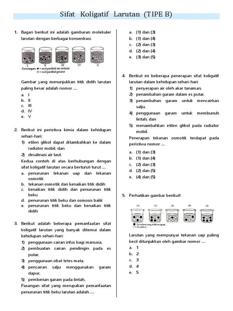 Sifat koligatif larutan meliputi tekanan uap, penurunan titik beku, kenaikan titik didih, dan tekanan osmotik. Adanya zat terlarut dalam suatu pelarut cair mengakibatkan . Jadi, sifat koligatif adalah sifat sifat fisik larutan yang hanya bergantung pada konsentrasi partikel zat terlarut dan tidak bergantung pada . Penerapan sifat koligatif yang berhubungan dengan tekanan osmotik adalah. Sifat koligatif larutan sendiri terdiri atas penurunan tekanan uap, kenaikan titik didih, penurunan titik beku, dan . Berikut ini penjelasan mengenai penerapan sifat .